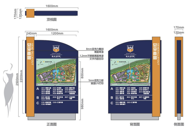 1.2mm不锈钢折弯焊接成型,通体汽车烤漆,文字丝网印刷,5mm钢化玻璃装饰面板,画面高清户外写真。