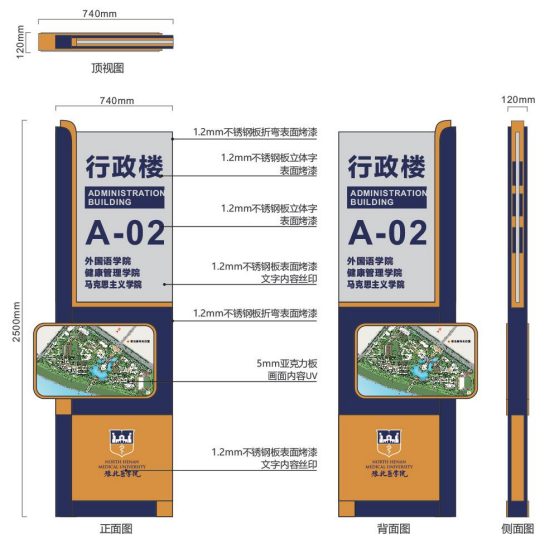 1.2mm不锈钢折弯焊接成型,通体汽车烤漆,文字不锈钢立体字、网丝印刷,5mm亚克力UV打印画面